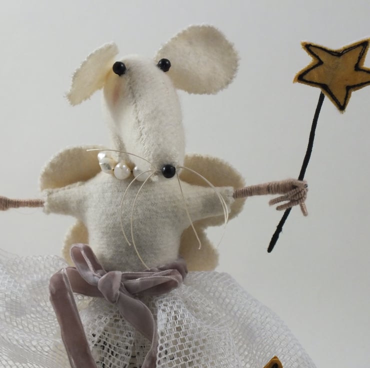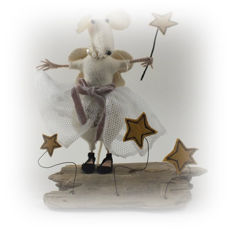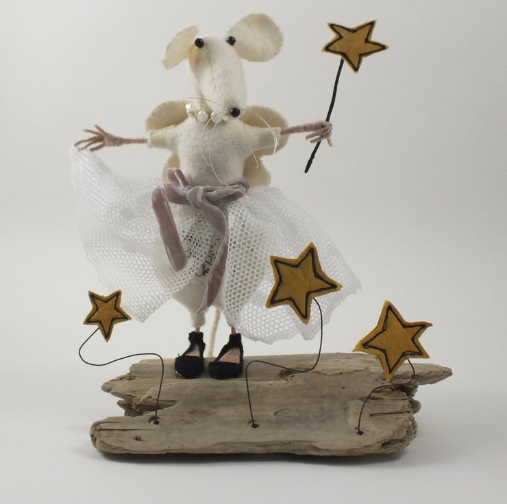 Phairee Mouse is made from hand stitched cashmere. She has black bead eyes and nose with vintage linen thread whiskers. Her hands and feet are wire wrapped with embroidery thread and she wears little felt shoes. The necklace is made from freshwater pearls and her lacy skirt is finished with a dusky pink velvet ribbon. She actually has a pocket stitched to her body where she keeps her phairee dust (where else )? The stars are machine embroidered and attached to rusty wire. Her wand has been wrapped with black thread. the base is driftwood.