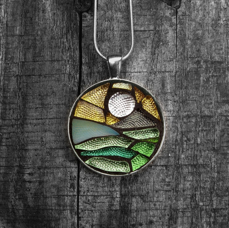 Pretty stained glass mosaic pendant featuring a moorland scene.