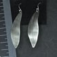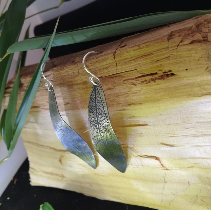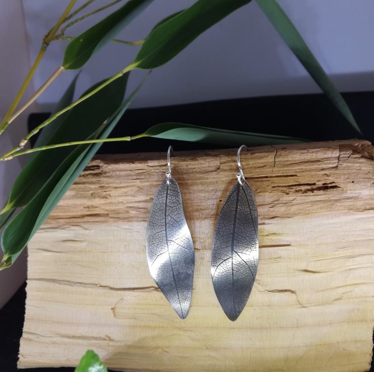 Silver earrings made into the shape of a leaf, imprinted by rolling a skeleton leaf onto the silver then oxidising the leaf to bring out the imprint of the veins. I make them in all different lengths and widths and also in copper and brass.