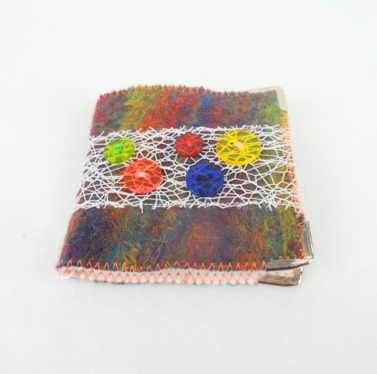 This super sewing needle case or mending kit is made using a piece of hand felted merino wool in a blend of rainbow colours. It has a strip of white lacey material and multicoloured "jelly" buttons stitched to the front as decoration.