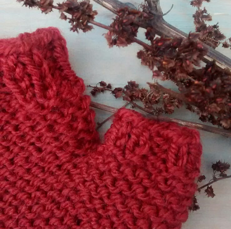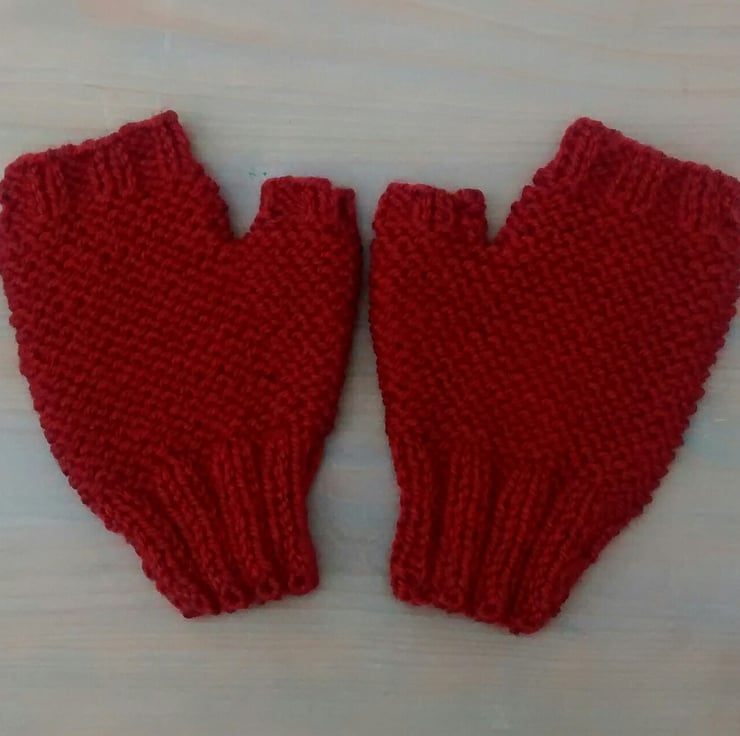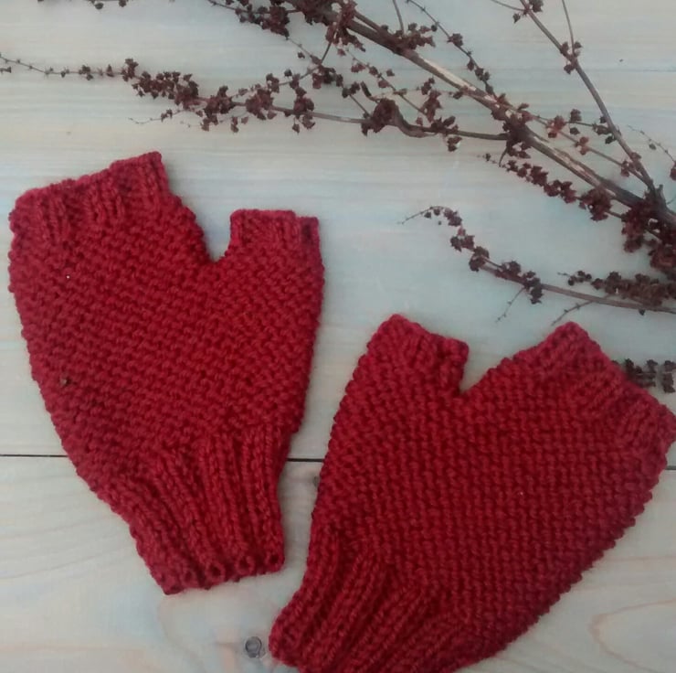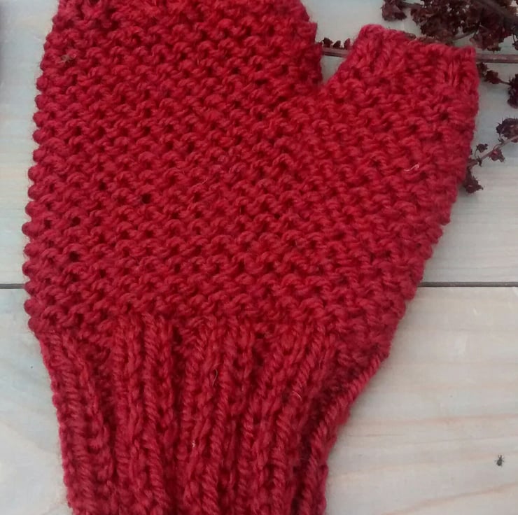 Hand knit fingerless gloves for men in russet coloured wool acrylic blend.