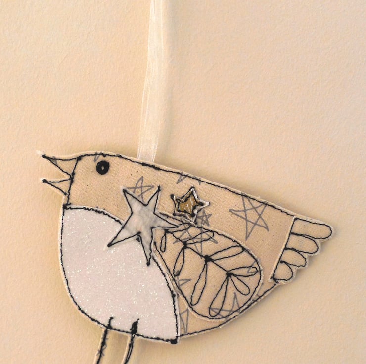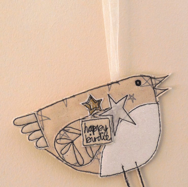 Meet Robin who is sewn using cotton fabric, he has a body printed with stars, a glittery chest and a sewn fabric label 'happy birdie'. He looks to me as though he is about to take flight!