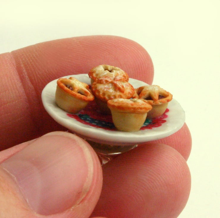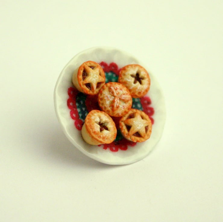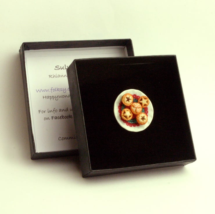 Have fun tempting people to break into festive song by wearing this cute pin brooch of miniature mince pies on a Christmas doily! Each mince pie has been hand made from polymer clay and carefully painted and glued in place on the ceramic plate. The doily has been painted in red and green with a tiny paintbrush and varnished, to give the brooch an an extra Christmas feel, and the brooch will come in its own smart black gift box.