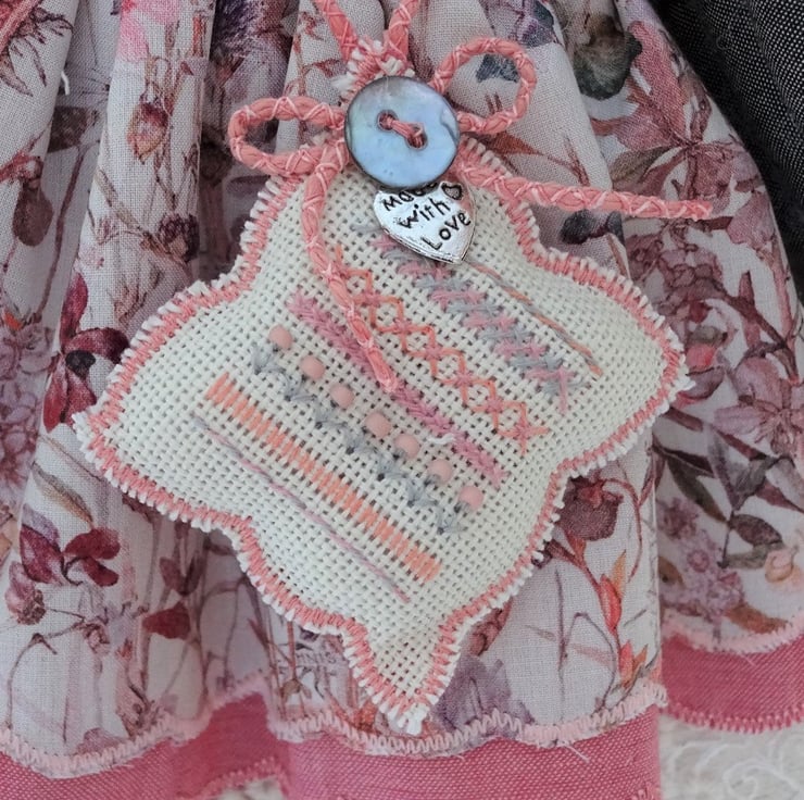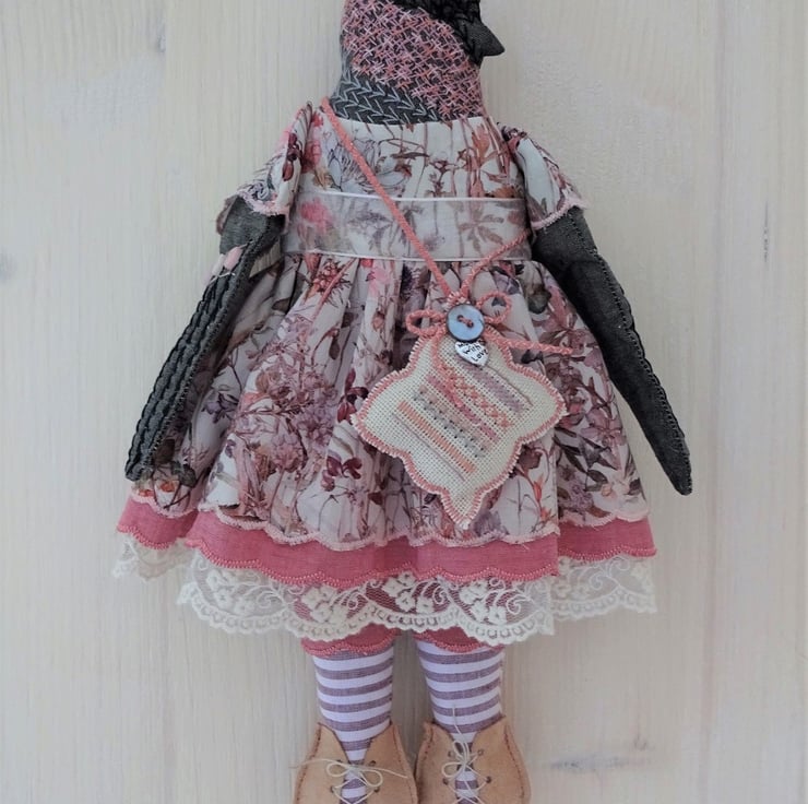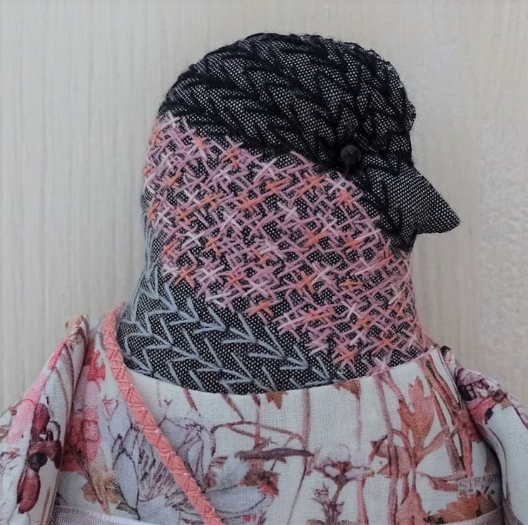 This is Hope, she is a hand embroidered Bullfinch rag doll. I use no paint to delineate the pattern but work freehand embroidery onto self colour cloth to make the plumage both on the front and the back of the doll. Hope is dressed in a pretty pink patterned cotton lawn from Liberty called Wild Flowers by Su Blackwell with coordinating underskirt and a final lace underskirt to finish. She has stripy legs and little leather shoes. Her dress is finished with buttons and ribbon and she carries a little lavender sachet that is also embroidered. She has a little brass ring to her back so she can hang.