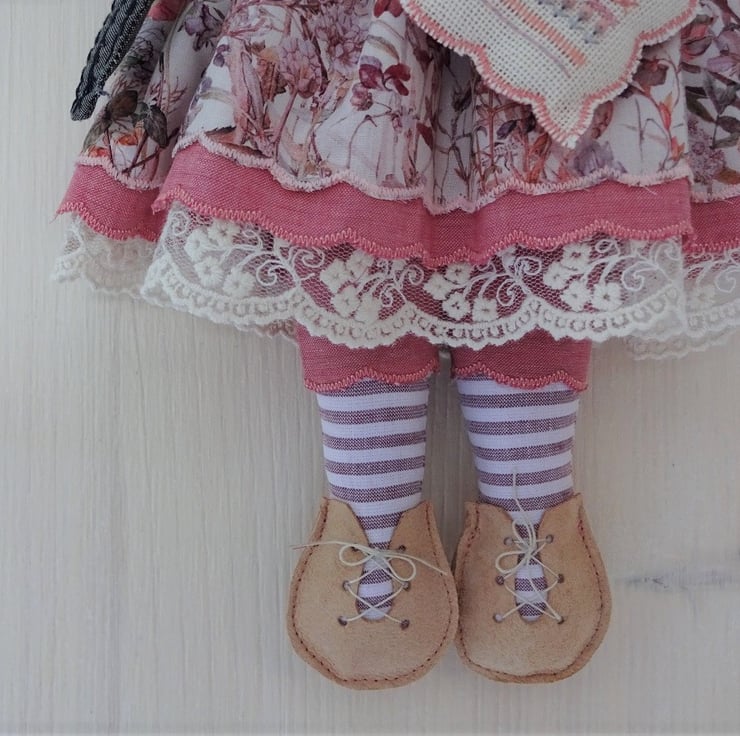 The fabric is a Tana Liberty Lawn called Wild Flowers by Su Blackwell inspired by the nineteenth century book A Field Guide to Britains Wild Flowers. The colours just help to accentuate the stitch and help to define the character of the doll, Quite often it is the fabric that fires the idea for the doll as happened in this case.