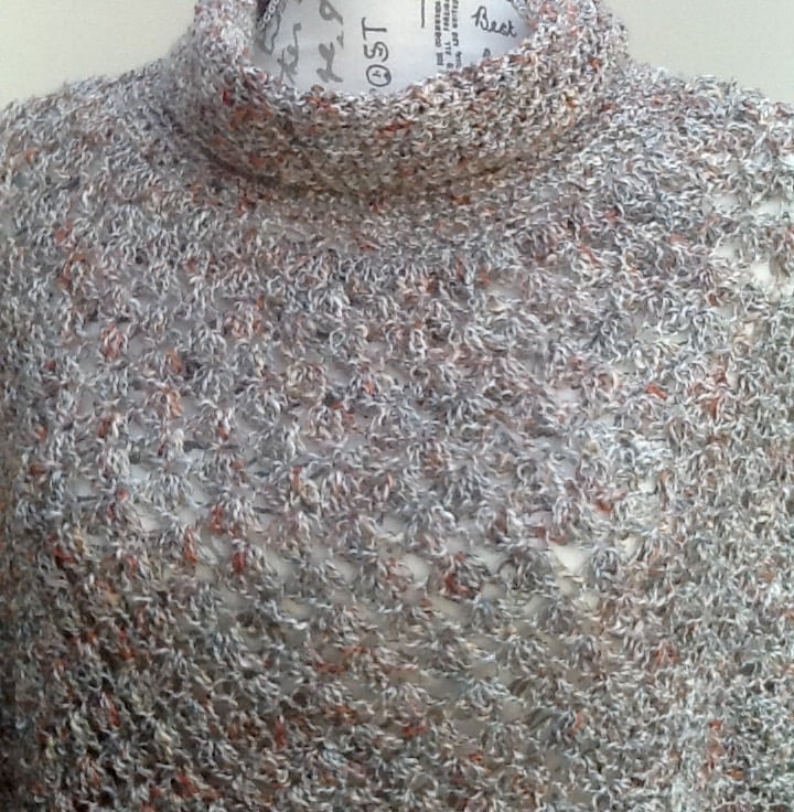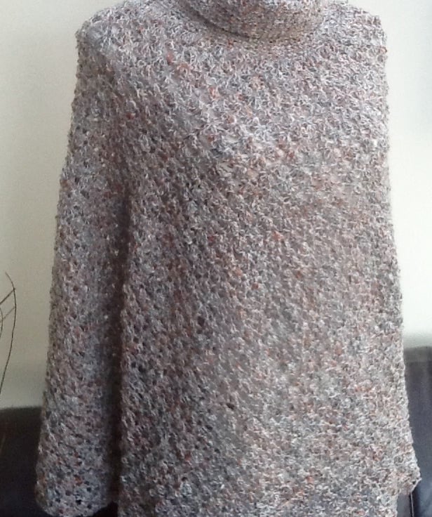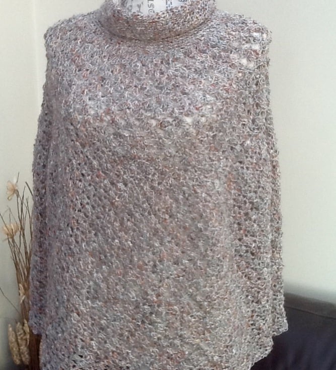 Monte Carlo Polo Poncho. Crocheted in 100% acrylic designer yarn on a large hoo in a tripple crochet stitch, to give a loose lacy design stitch, and simple double crochet at the neckline. Perfect to go over any outfit!