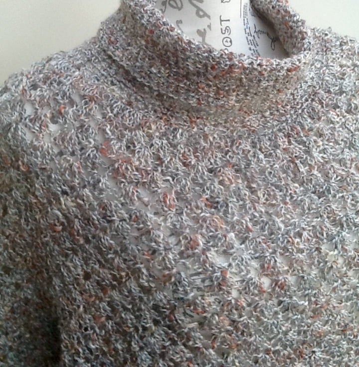Crocheted in a continuous line, starting at the polo neck and increasing in stitches, to allow for shoulder and body width. There are no seams or joins in this item of clothing.