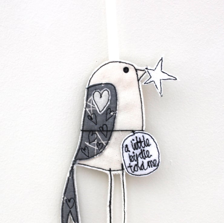 Meet little birdie who is sewn using cotton fabric, he has a body of cream, wings printed with stars and sewn with hearts, is holding a glitter fabric star in his beak and a sewn fabric label 'a little birdie told me'.