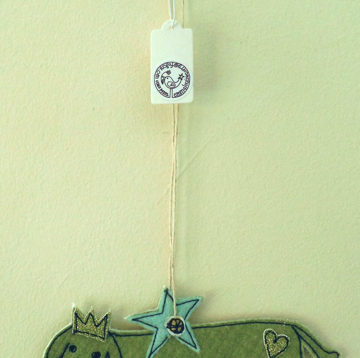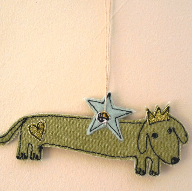 A sewn fabric sausage dog, with a pale green felt star, a glitter heart and a sewn glitter fabric crown. Sausage dog is a happy doggy, who would complement your Christmas tree or make a unique gift.