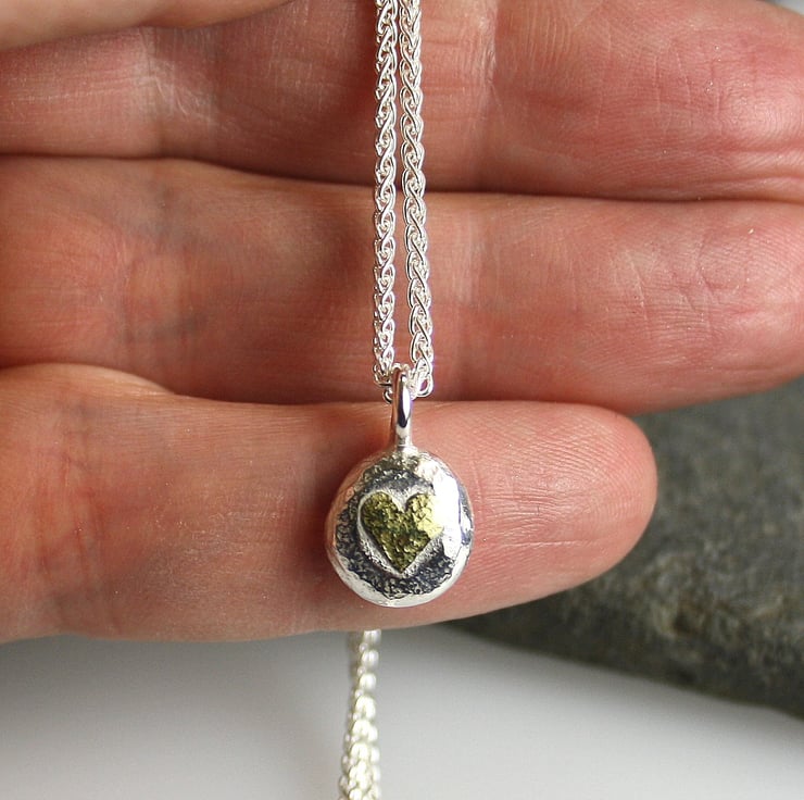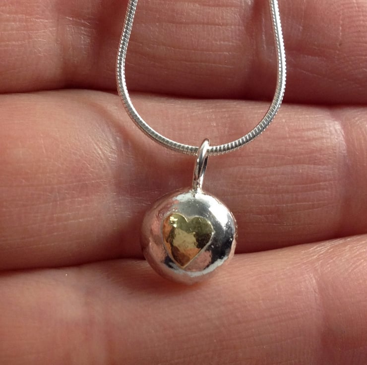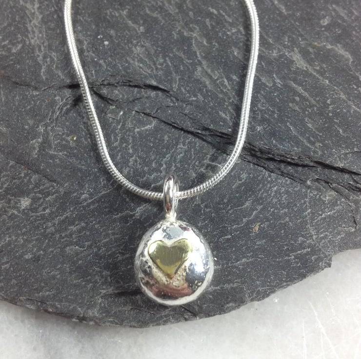 Solid thick sterling silver pebble with yellow gold heart detail. The pendant is loosely round in shape , it has a beaten texture and has been polished to a subtle shine.