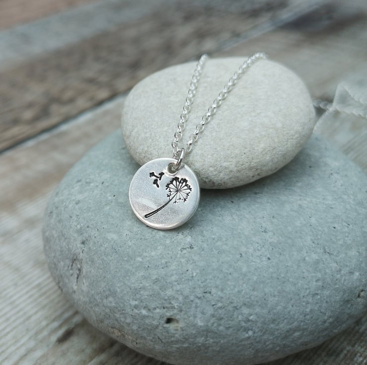 This handmade necklace, created from recycled silver, features a beautifully hand stamped dandelion charm that captures the elegance of nature in a simple, refined design. The delicate seeds gently floating away from the dandelion add a touch of whimsy and symbolism, representing hope, dreams, and new beginnings. The soft matte finish of the charm contrasts with the polished chain, making this necklace a versatile piece that complements any style.