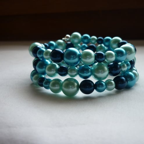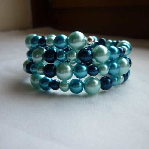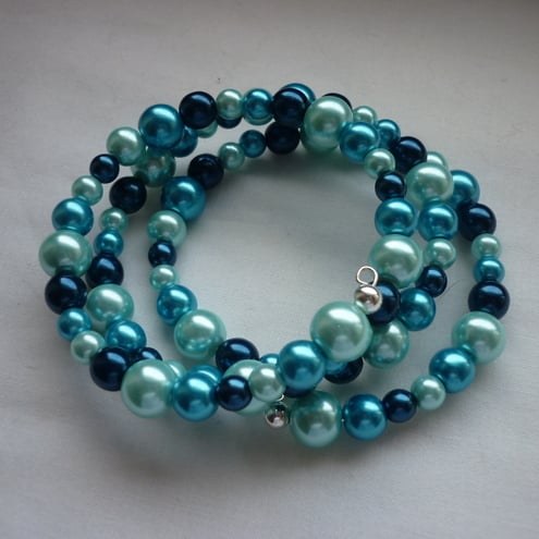 THIS EASY TO WEAR BRACELET IS MADE FROM GLASS PEARLS IN SHADES OF TURQUOISE, AQUA AND MONTANA BLUE AND HAVE BEEN STRUNG ON MEMORY WIRE WHICH WRAPS AROUND YOUR WRIST SO NO CLASP IS NEEDED.