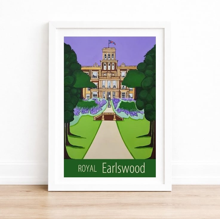 A contemporary travel poster style print of Royal Earlswood in Redhill, surrounded by trees and lavender, from my own original acrylic painting. A perfect gift for those who love Royal Earlswood!