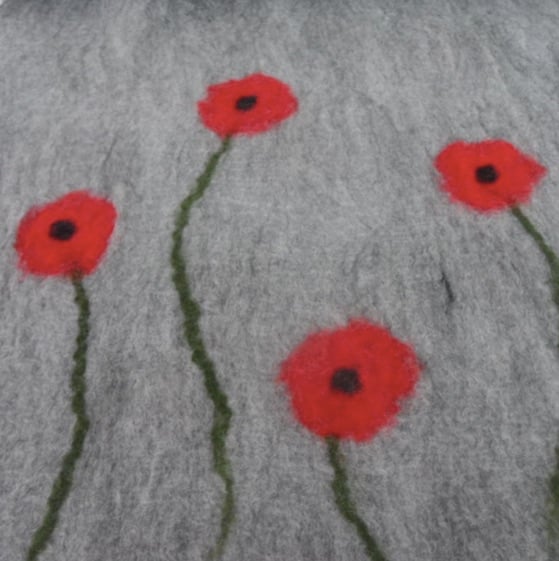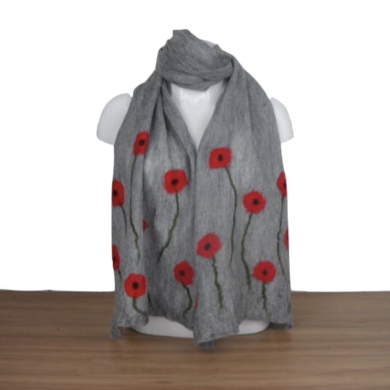 A gorgeous grey scarf with vibrant poppy decoration made by nuno felting soft merino wool onto a silk chiffon base.