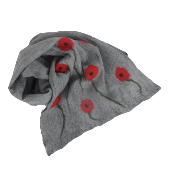 A very fine layer of natural grey merino wool has been nuno felted to both sides of a grey silk chiffon base material and a decoration of red poppies has been added to both ends on one side prior to felting. The nuno felting technique causes the woollen fibres to migrate through the silk and bind with it. The resulting scarf is super soft and lightweight. Due to the fineness of the woollen layers it maintains much of the sheer nature of the underlying silk while adding warmth and softness.