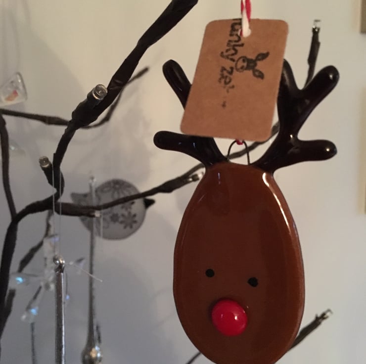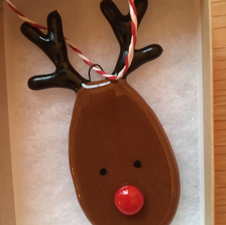 A beautiful handmade fused glass Rudolph Christmas decoration made from fused bullseye glass . The decoration is strung with red and white twine for easy hanging and will make a beautiful addition to your Christmas tree. The price is for the decoration without a box ( to avoid unnecessary packaging but there is the option to add a gift box in the dropdown menu at checkout. Please note that as each item is handmade it may differ very slightly from the image listed
