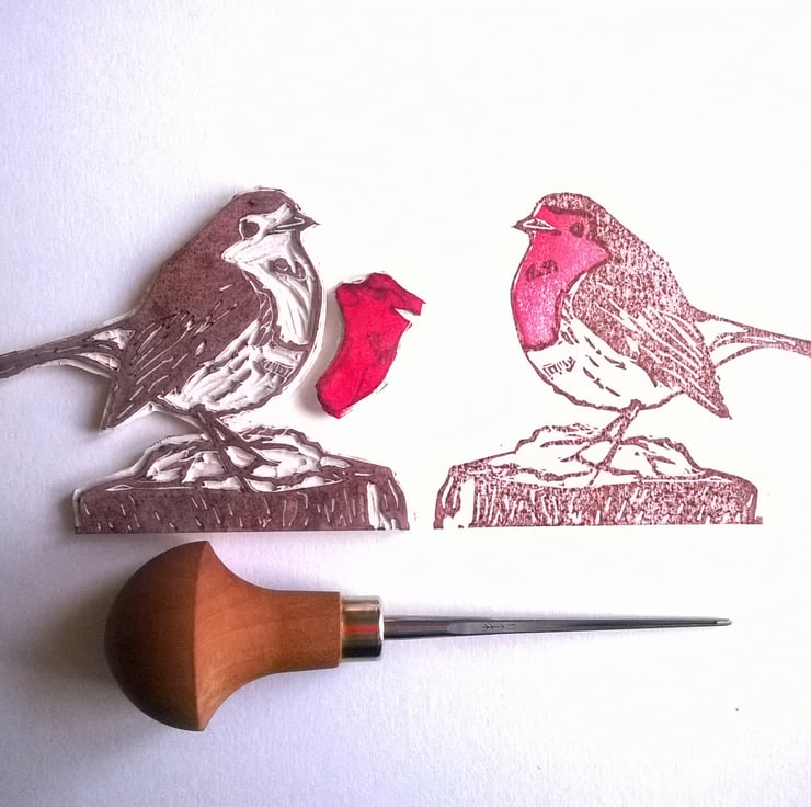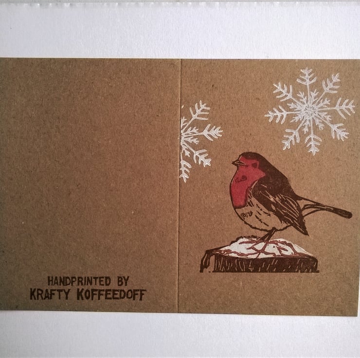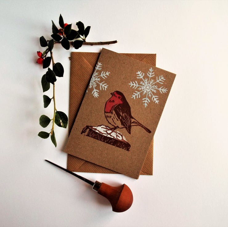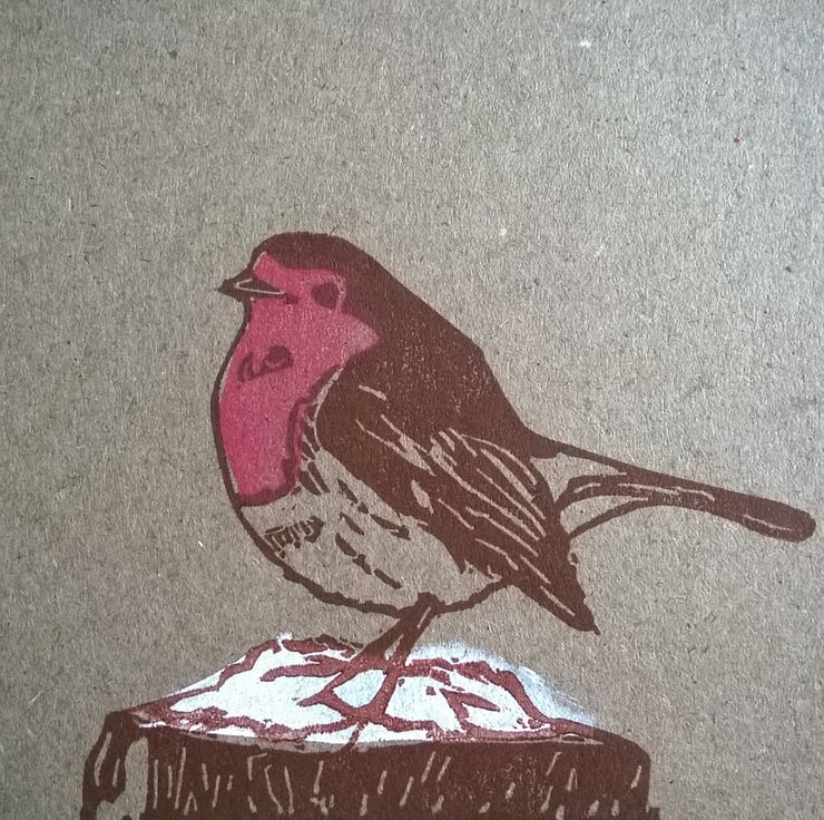 Hand printed Christmas card depicting a winter robin made using hand carved linocut. Printed onto recycled kraft card using safe wash oil based ink.