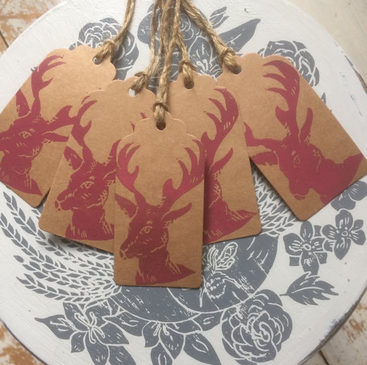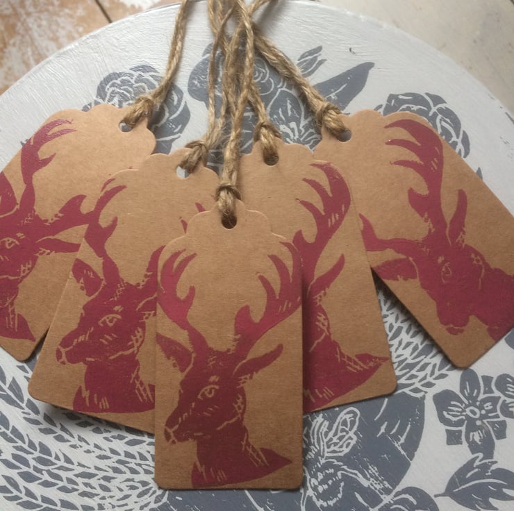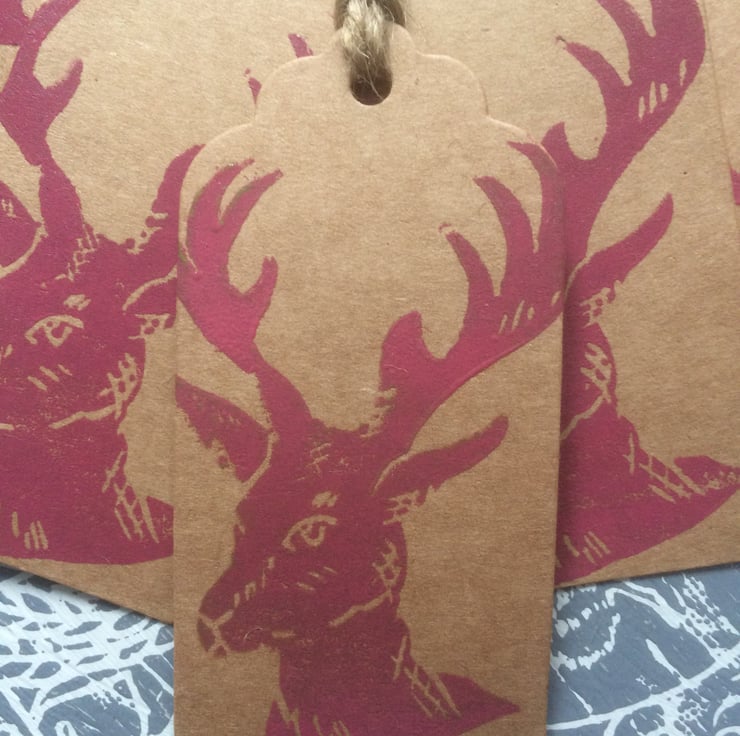 Set of five gorgeously pinky purple gift tags, hand printed with a stag in linseed oil ink.