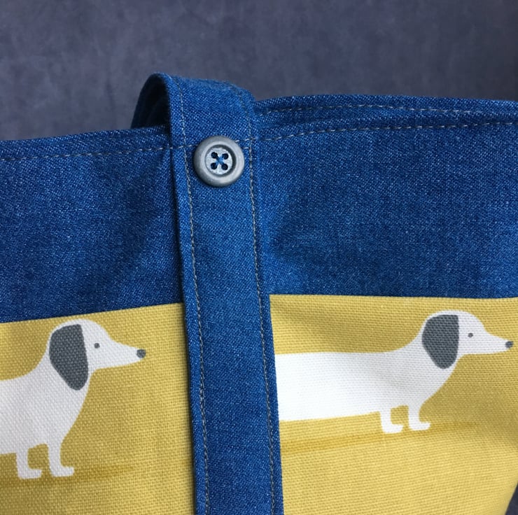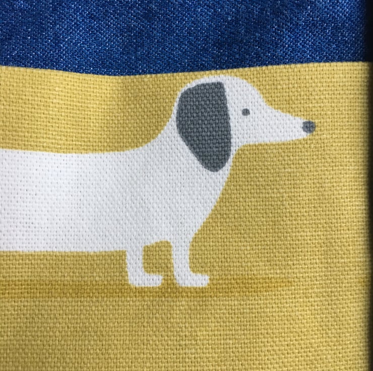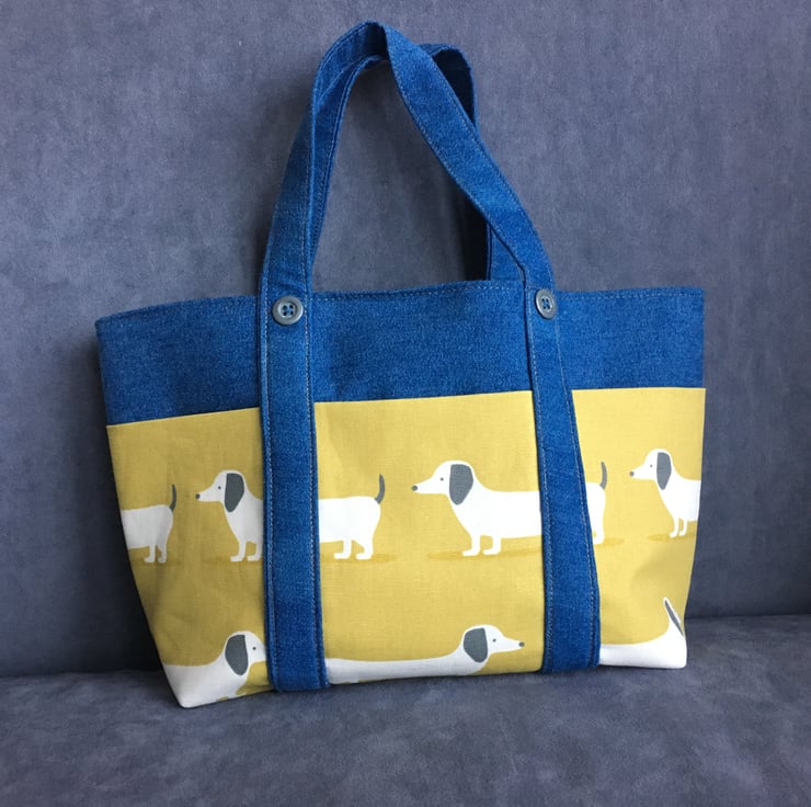 Handy little bag with 6 pockets around the outside and a generous main section which is fully lined. This bag has been made from recycled denim and a cute dachshund fabric. It is finished with buttons saved from the original denim garment.