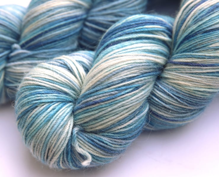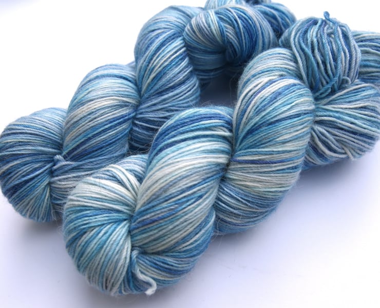 Off-white/cream (undyed) with soft shades of blue. This is a delightlfully soft and squashy superwash merino, alpaca and nylon blend in a 4-ply weight. It is very soft with a characteristic alpaca 'halo.' There are two skeins available (price shown is for one). Photos have been taken and edited in bright natural light - first photograph is most accurate for colour.