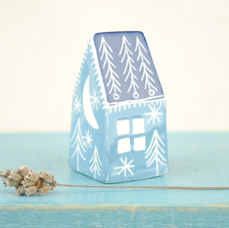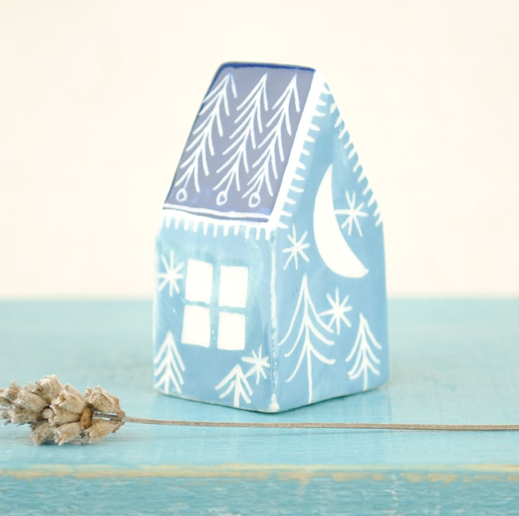 This house is hand built from white earthenware clay, decorated with coloured slip and finished with a hand drawn design using the scraffito technique.