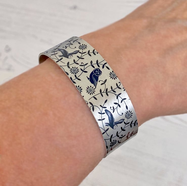 Cuff bracelet with a delightful owl design. It has a brushed silver background with black owls. Handcrafted jewellery, made in the UK. Ideal gift for a nature and owl lover. In addition, for a small fee, a personal message can be engraved on the reverse (Optional).