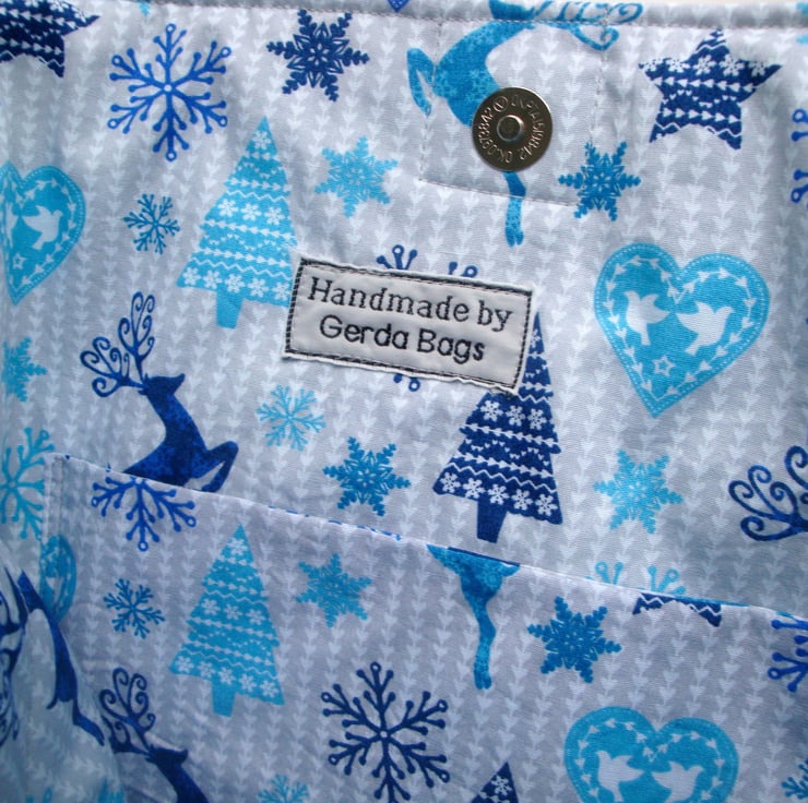 Made in a lovely Christmas cotton fabric & a pretty red/white cotton fabric ( red/white fabric on front only ) . Fully lined in a festive cotton fabric & lightly padded for extra body & softness .