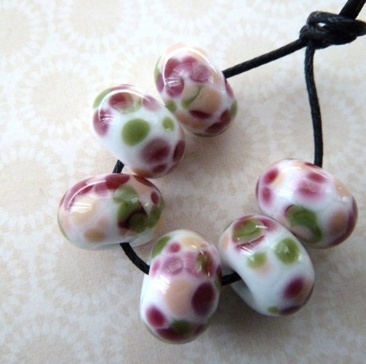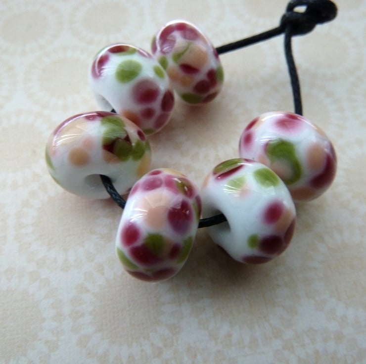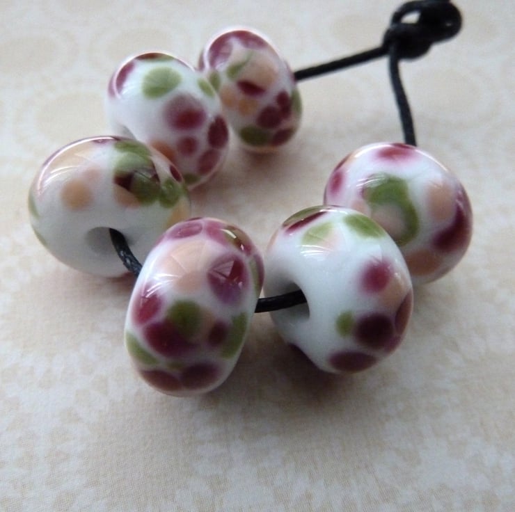 A set of 6 handmade lampwork glass beads made with white glass and rolled in frit.