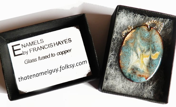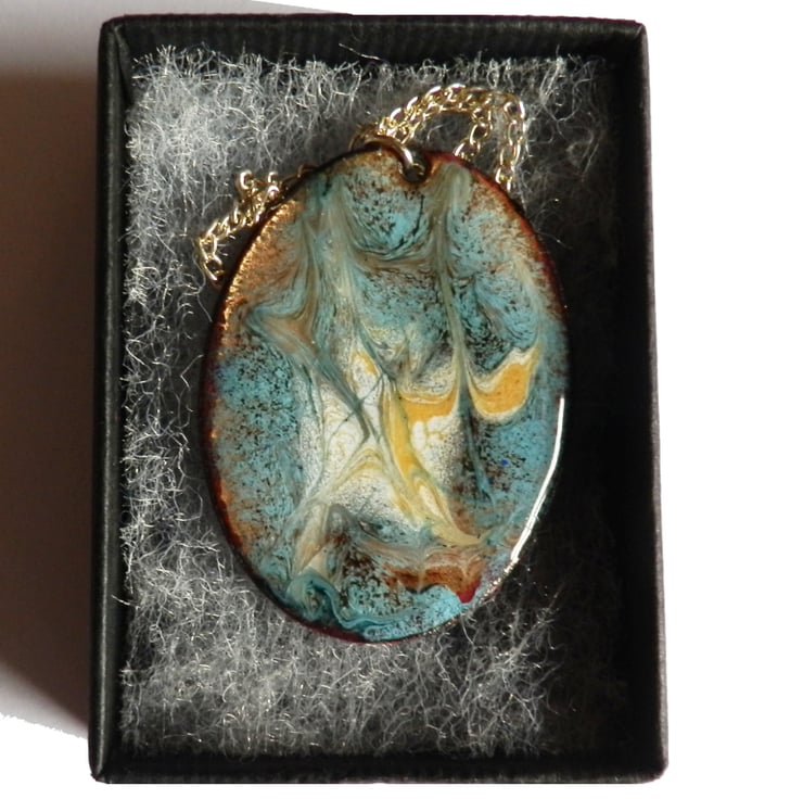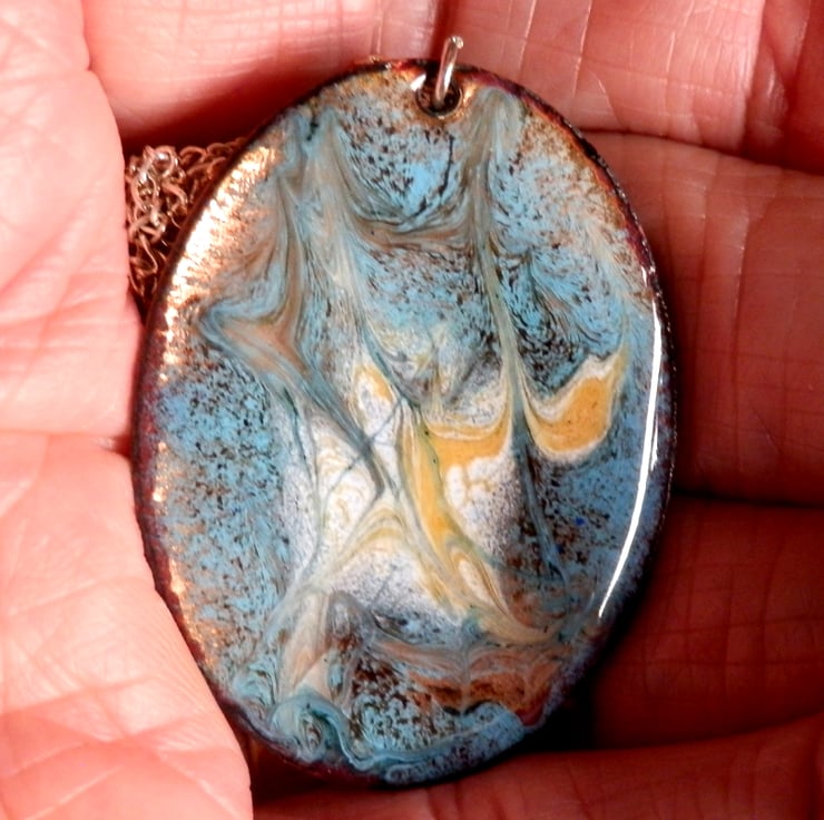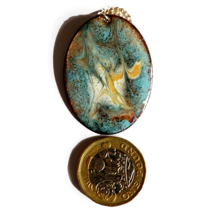 After first building a base coat of layers of clear enamel over the copper shape I added a thin layer of turquoise. The copper base shines through in places, golden brown. Over the turquoise I scattered small pools of white and gold enamel then drew through these when they were red hot in the kiln to generate the random swirle pattern you see.