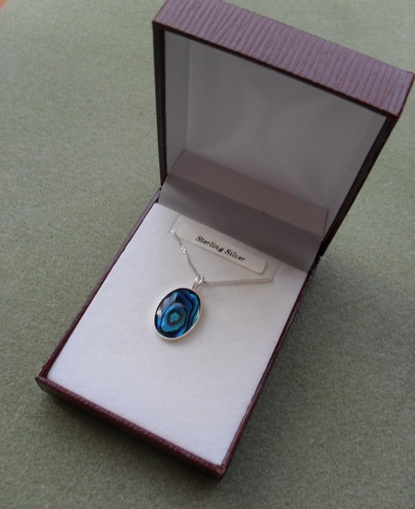 Blue abalone shell with colours of green which can be seen as the shell moves set in a sterling silver mount and suspended from a 18 inch sterling silver chain