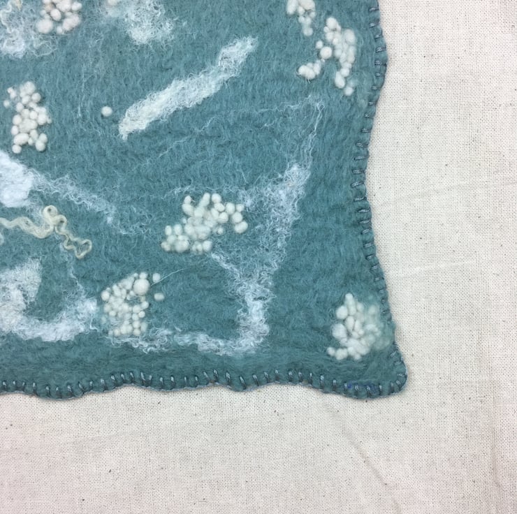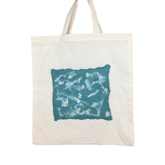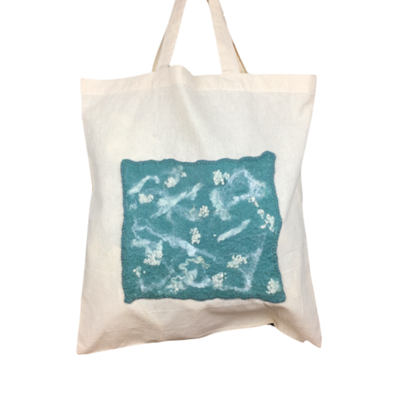A lovely handmade felt panel in a duck egg blue merino wool with white wool and silk embellishment has been stitched to the front of this hardwearing cotton tote shopping bag. Ideal for keeping in your handbag for use when out shopping. The bag measures approximately 39cm (w) x 40cm (h - excluding handles) (15.5" x 16") and would make a lovely gift, a perfect secret santa or stocking filler.