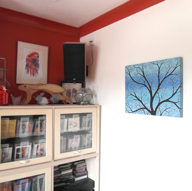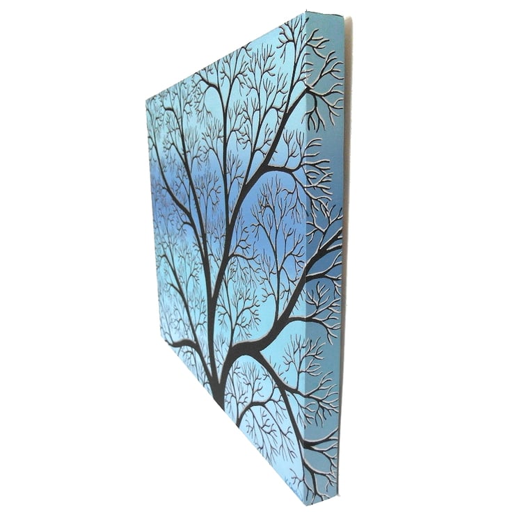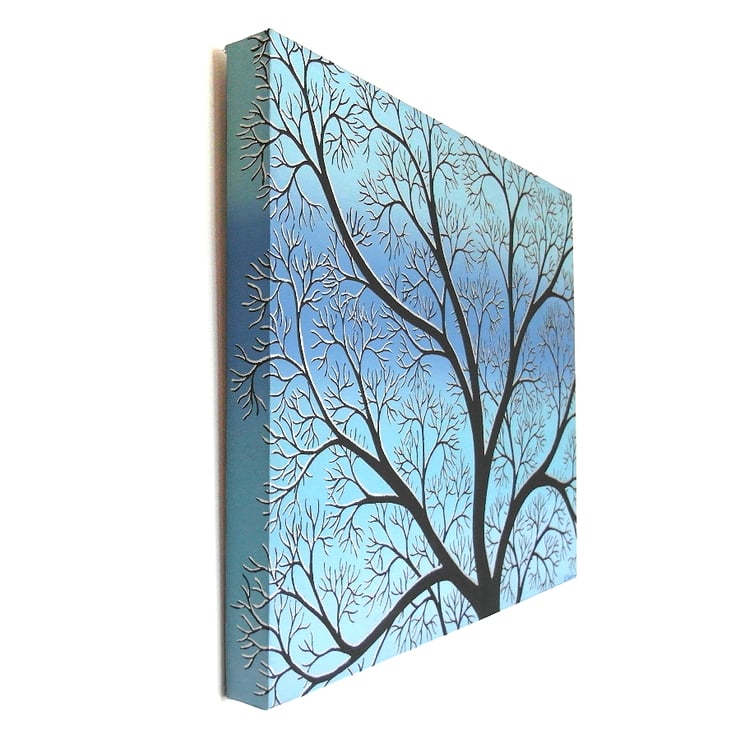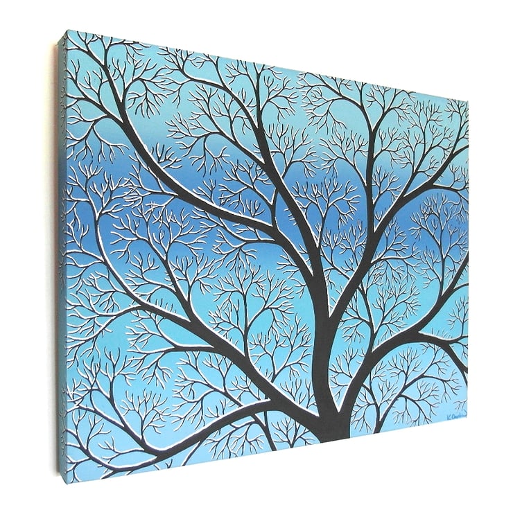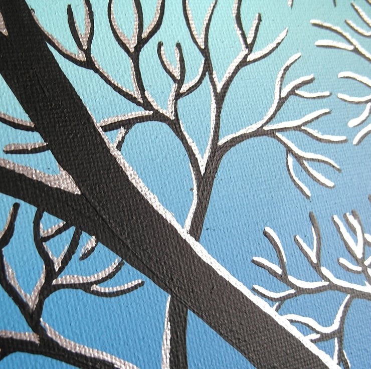This tree art is painted in acrylics, with metallic enamel for the silver, on a 50cm x 40cm (3.5cm deep) (19.7"" x 15.7" x 1.4") canvas. The image carries on over the edges of the canvas so there is no need for framing, and the canvas has a string on the back so it is ready for hanging.