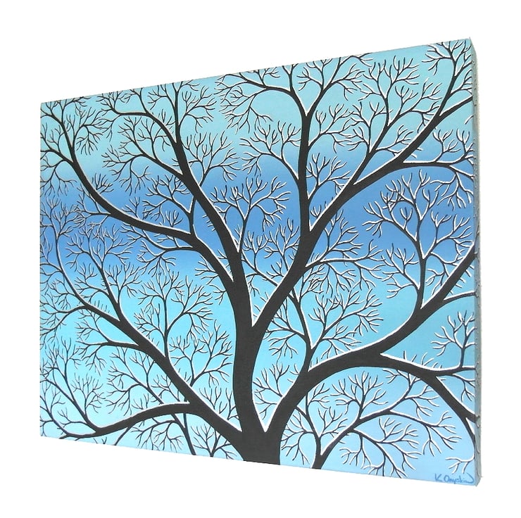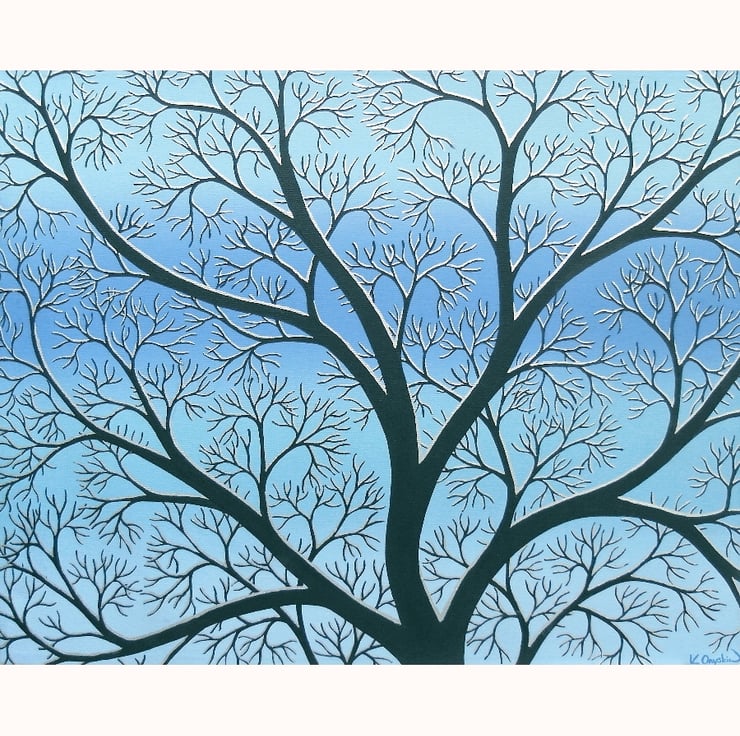 An original painting with the black silhouette of a bare winter tree with silver snow on the branches, which reflects to catch the light. The background is subtle blended stripes of blues and turquoises.