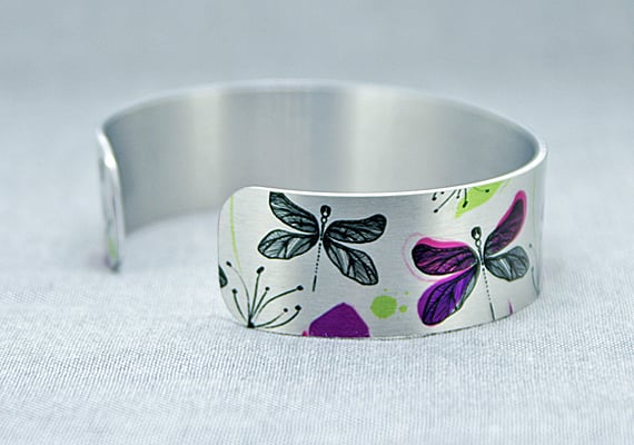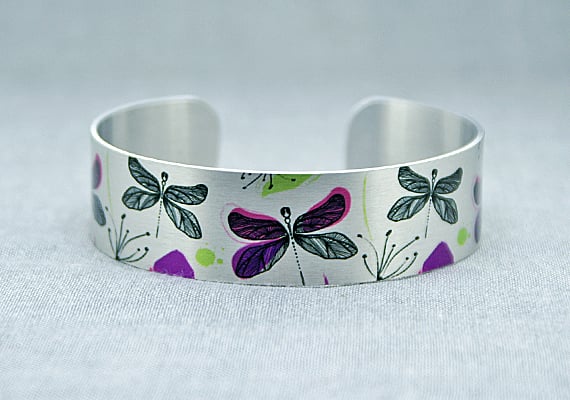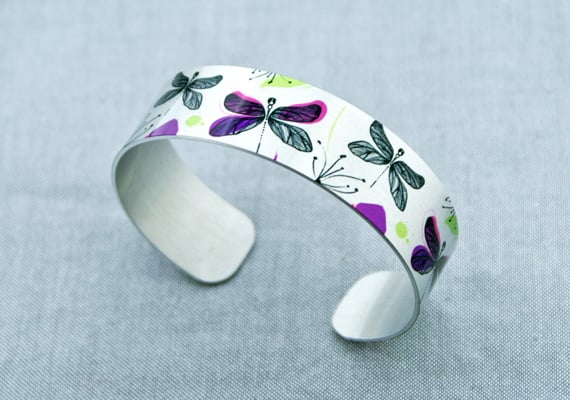 Narrow cuff bracelet with a brushed silver background and dragonflies. Handcrafted jewellery, made in the UK. Ideal gift for a nature and dragonfly lover.