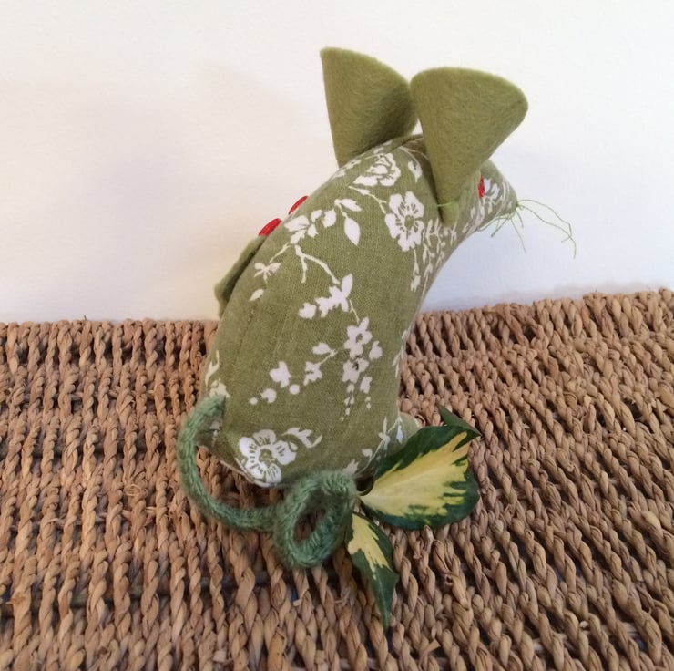 This Mouse mouse has button eyes, felt ears and a plaited wool tail and cotton whiskers, and a button and felt holly decoration. She is approx 10cm tall from the tips of his toes to the top of his ears and approx 11cm from her nose to her bottom.