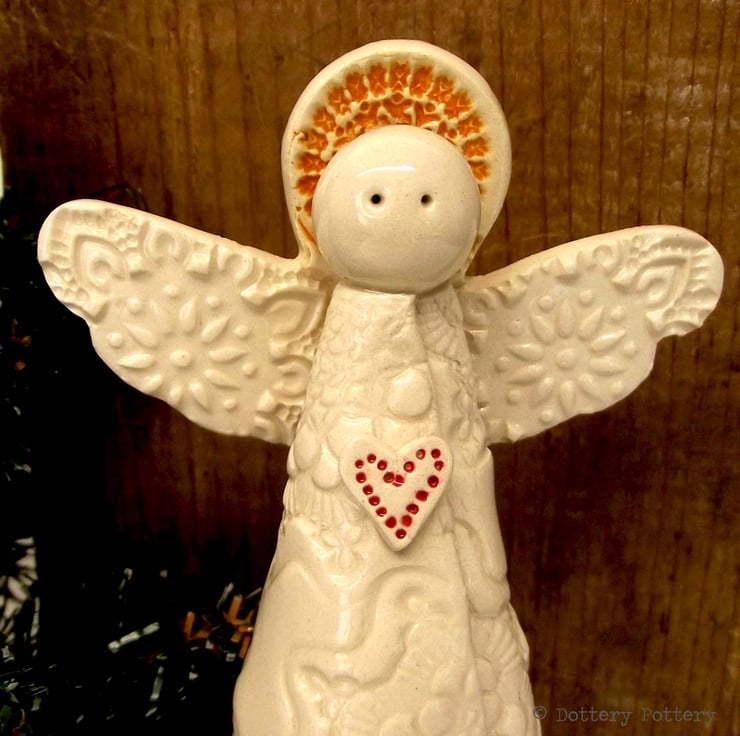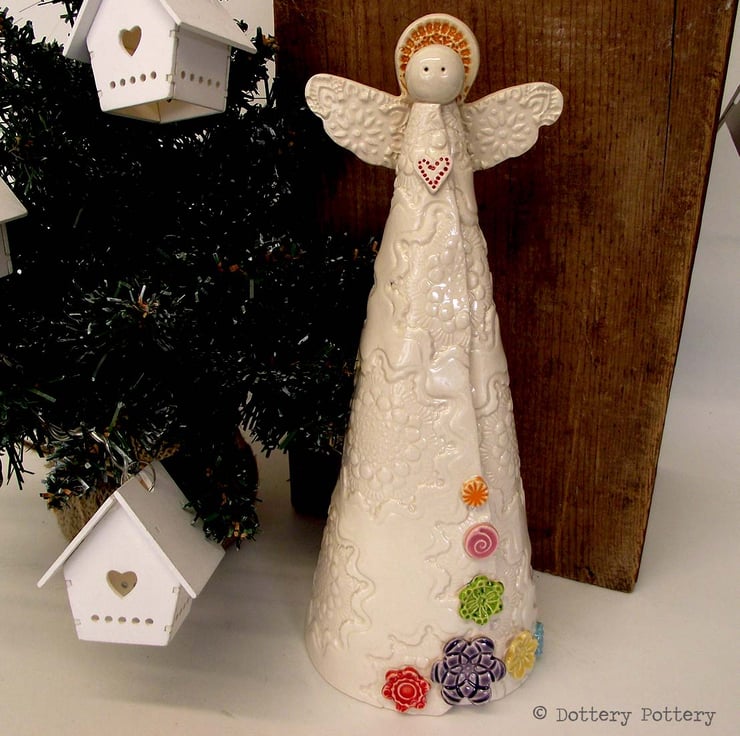 This highly decorative ceramic Angel is made from white earthenware clay, twice fired and finished with a rich, glossy glaze.