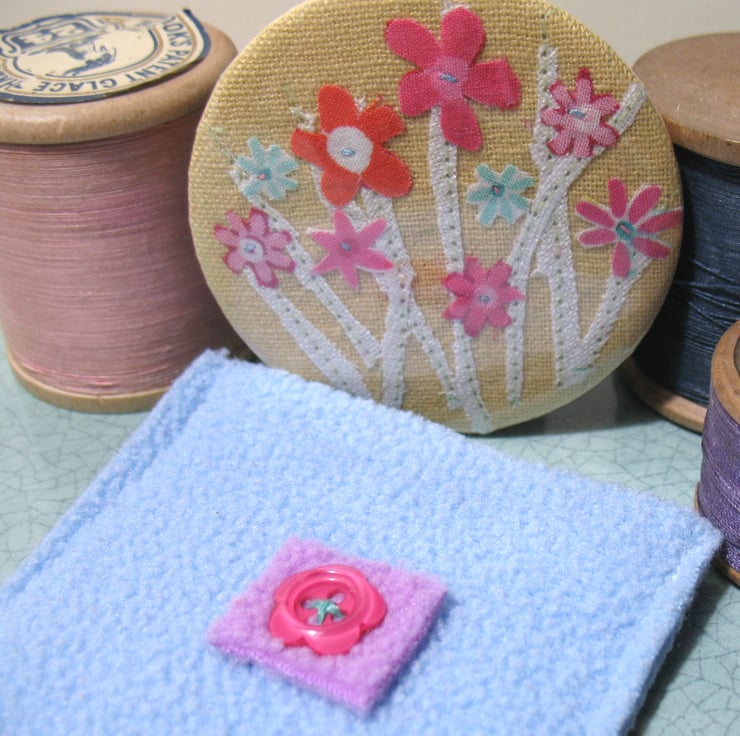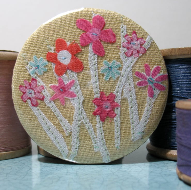 The 'Flowers' design has been individually hand cut and stitched from cotton fabrics onto a primrose yellow linen background and a clear protective backing added so it can be wiped clean. The metal rimmed mirror measures 58mm diameter and comes with its own pouch with button detail. (as shown)