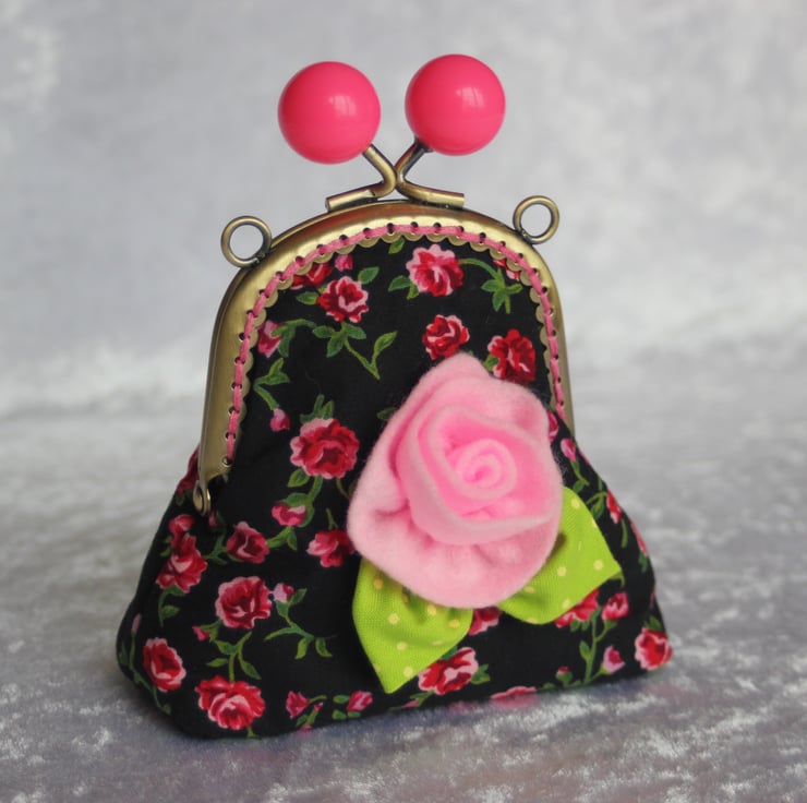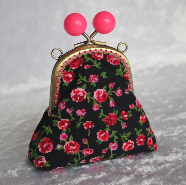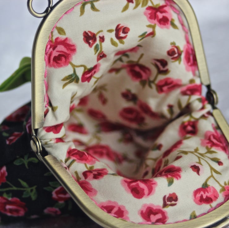 This little coin purse is 100% cotton, with a vibrant flower pattern inside and out. The lining seam is hand finished, and the purse has been interfaced and wadding applied to give it a soft feel and to add structure. The antique bronze frame has chain loops and has been sewn with 3 strands of embroidery silk.