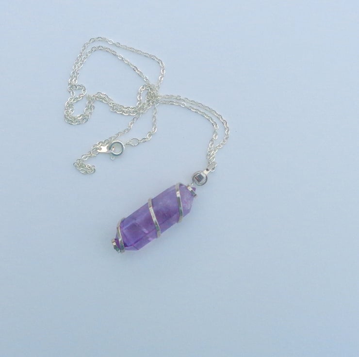 A length of flat sterling silver wire wrapped around a six-sided chunk of natural pale amethyst stone creates this beautiful and unusual pendant.