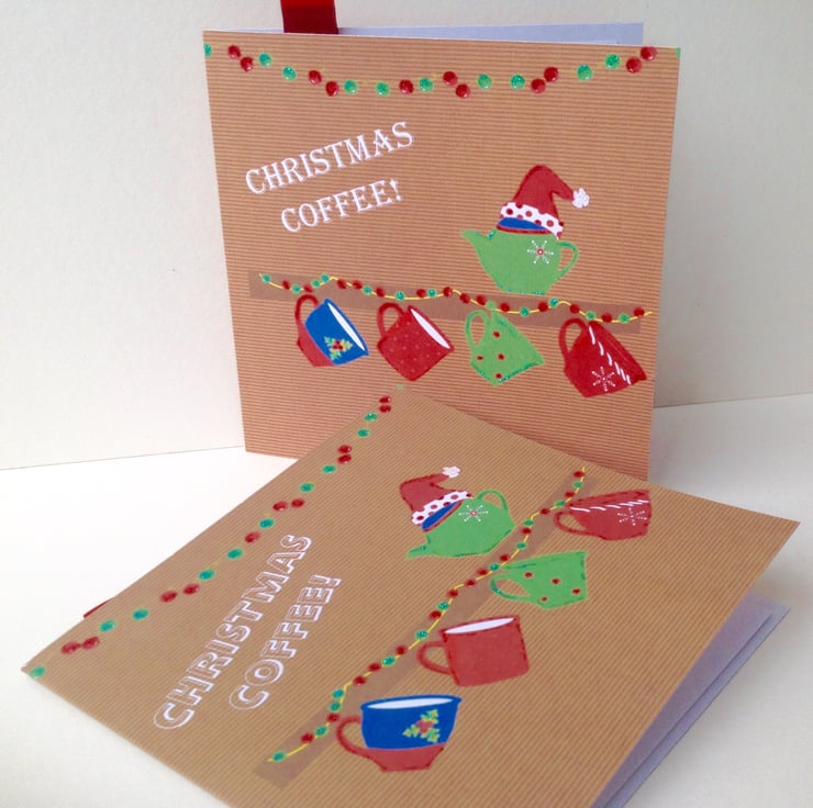 The listing is for a fun pack of Christmas Cards, featuring decorated, festive cups and a tea, coffee pot.