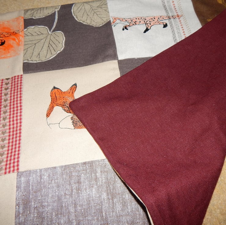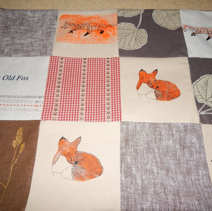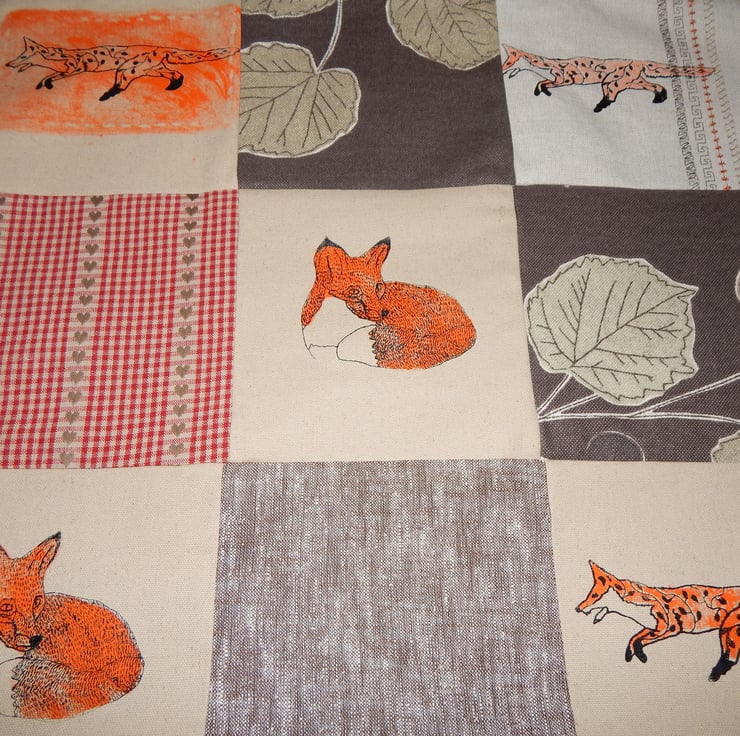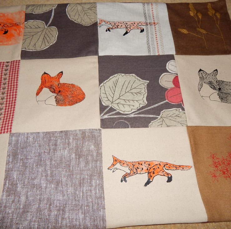 This is a lovely patchwork rug/mat which has been screen printed with 6 foxes. There is decorative machine stitching in shades of orange and brown. I have screen printed grasses in gold colour and a wild flower in red. The mat is backed with thick cotton upholstery style material, plain burgundy in colour.