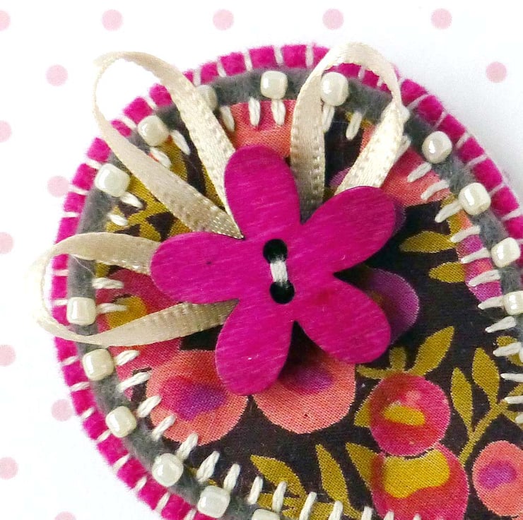 The brooch is entirely hand stitiched and features an applique paisley design in lovely Liberty of London fabric. It has been sewn onto dark grey felt which has been edged with cream seed beads, it has been further mounted onto fuchsia pink felt and is finished with a feature flower button and ribbon detail. There is a metal brooch pin on the reverse side for easy attachment.