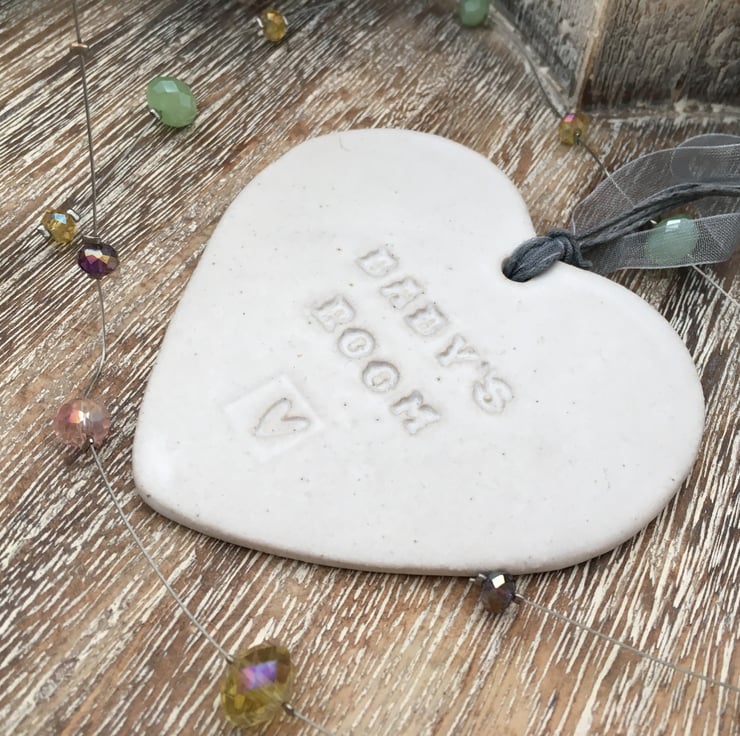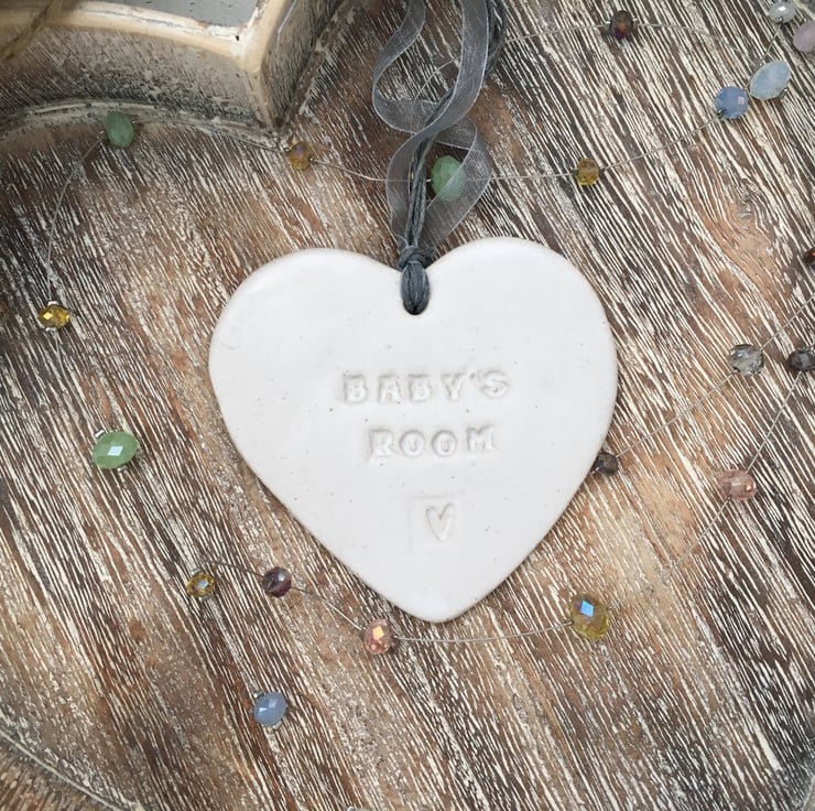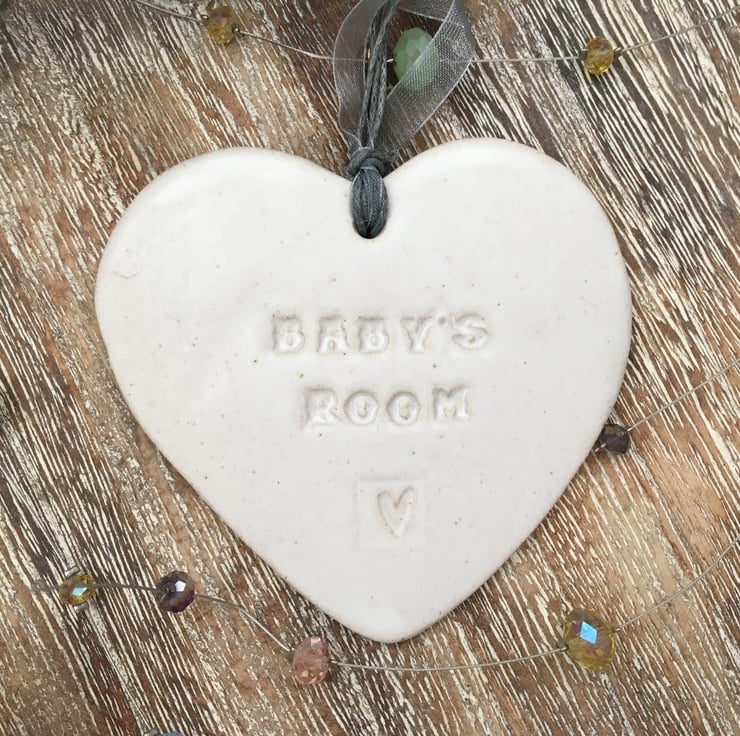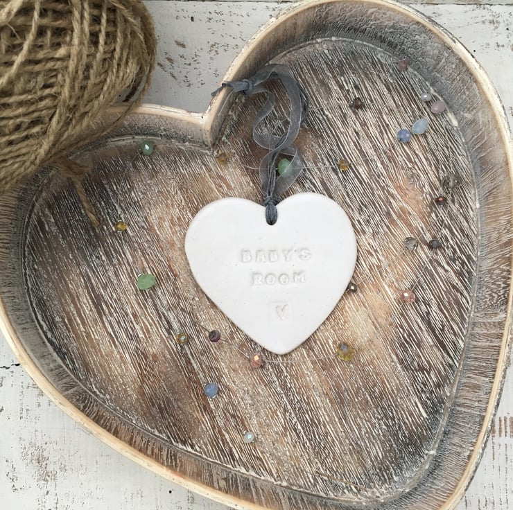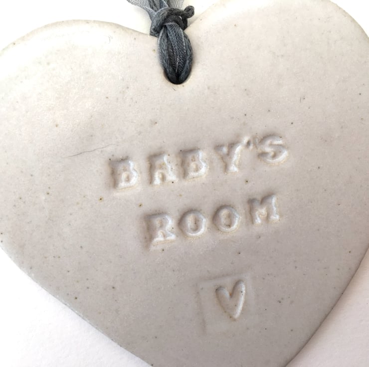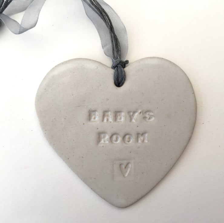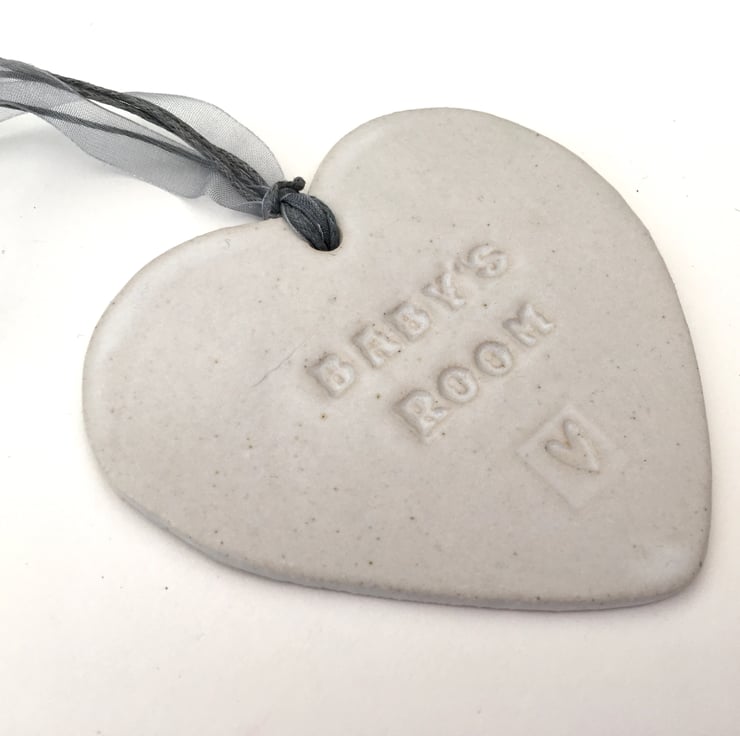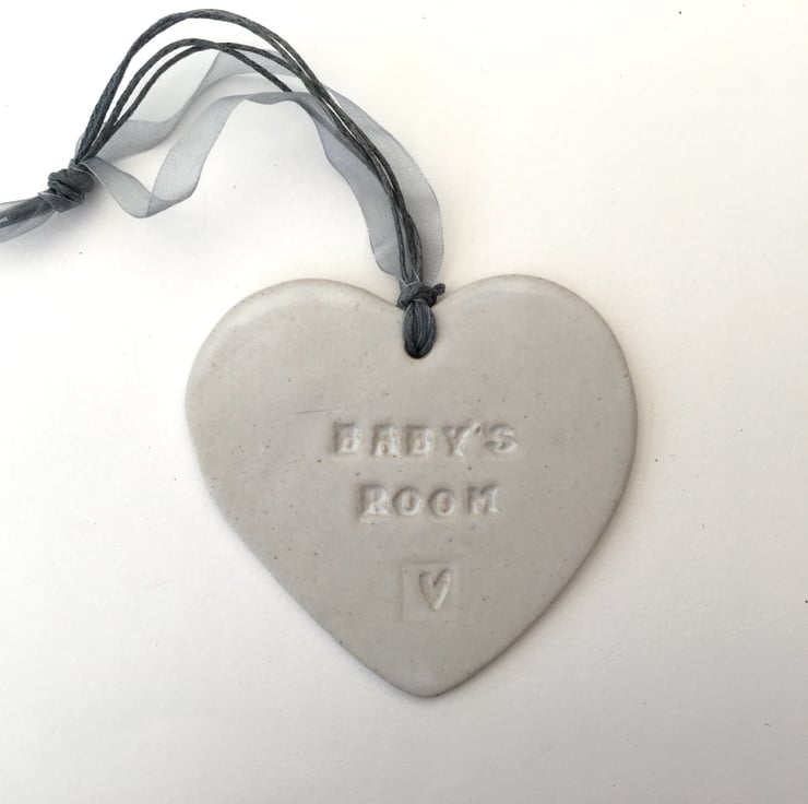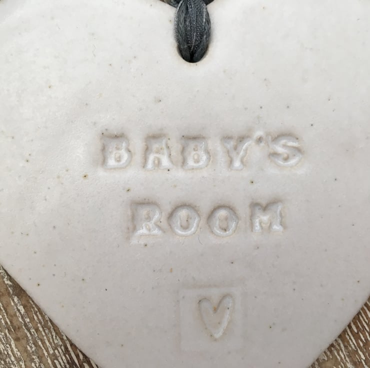 This Loveheart is strung by a grey ribbon and has the words 'Baby's room' pressed around the edge.