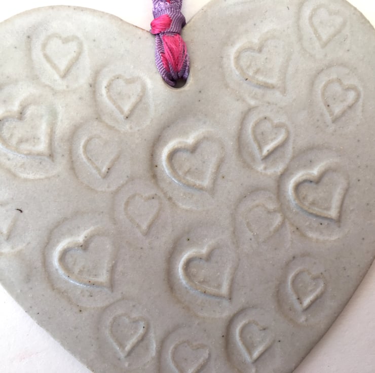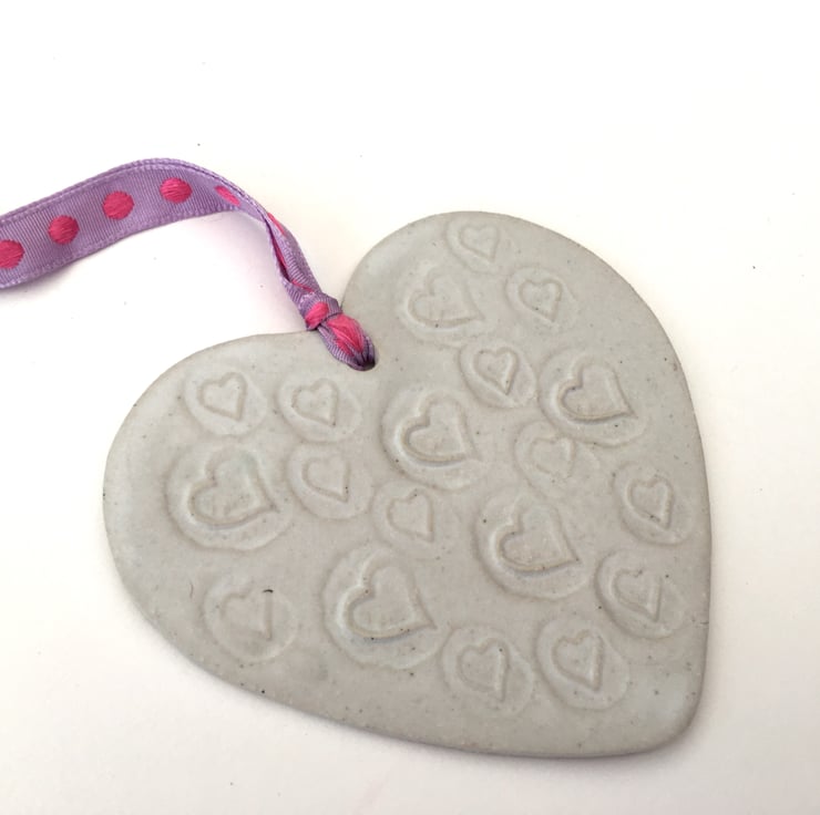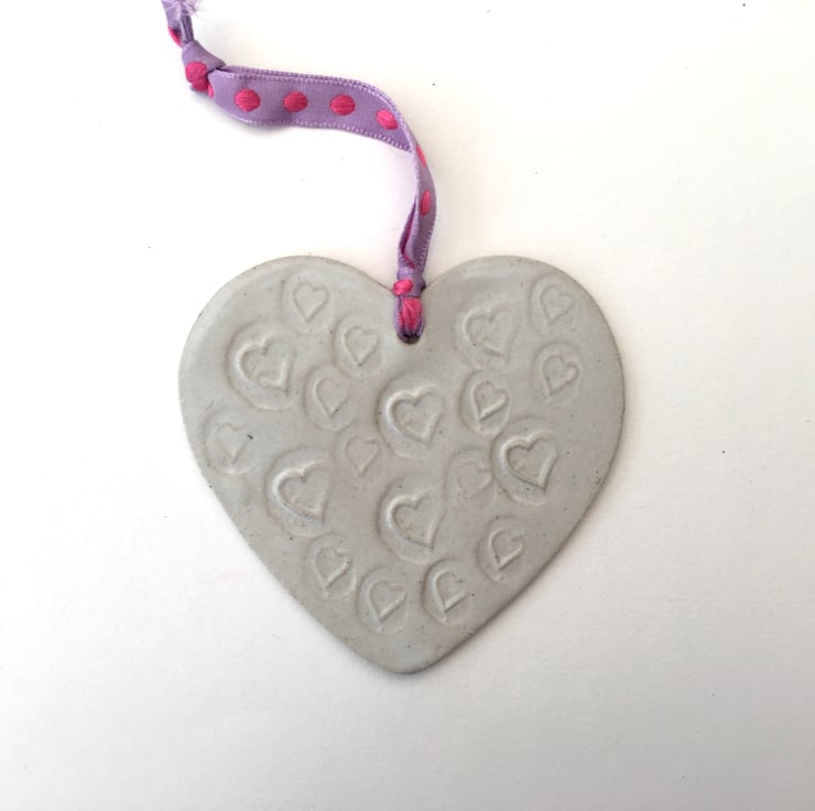 This Loveheart is strung by a pretty pink and purple ribbon.