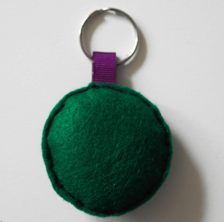 Hand cut, hand sewn using felt and with cotton thread On the top is attached a keyring, using a sewn in piece of purple ribbon. The keyring inside is lightly stuffed. A cute white button makes the wheel.