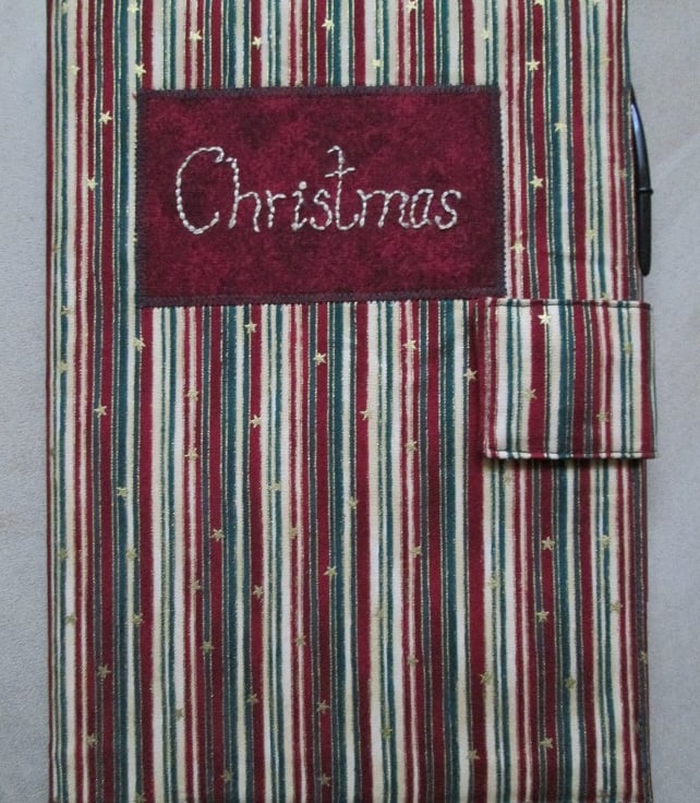 Just the job for keeping track of all those festive season details - this A5 notebook cover can be reused year after year, just replace the notebook when it's full. The outside is a rich festive stripe with metallic highlights and hand embroidered label, and the lining a ditsy holly print on cream. It has an integral pen holder, place marker and the extra deep side pockets are ideal for tucking away receipts etc. Notebook and pen included and, if you wish, you can upgrade the pen to a Parker Jotter for just £5.00 extra.