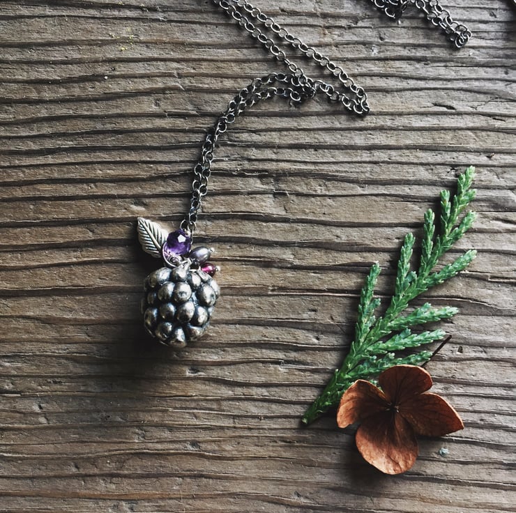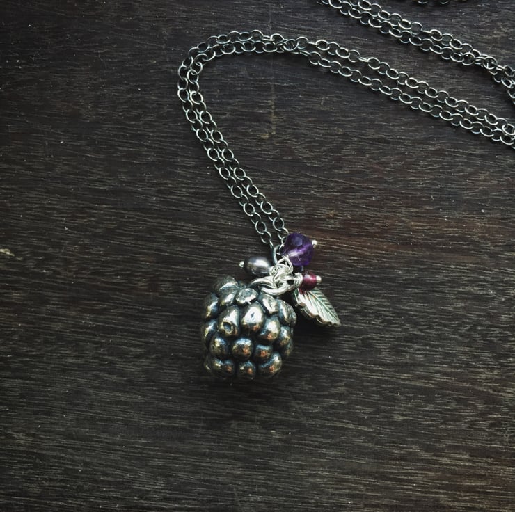 The sterling silver blackberry has been cast into solid silver from a real blackberry and oxidised to bring out the shape. It is adorned with a little garnet, amethyst and great pearl and a little silver leaf.
