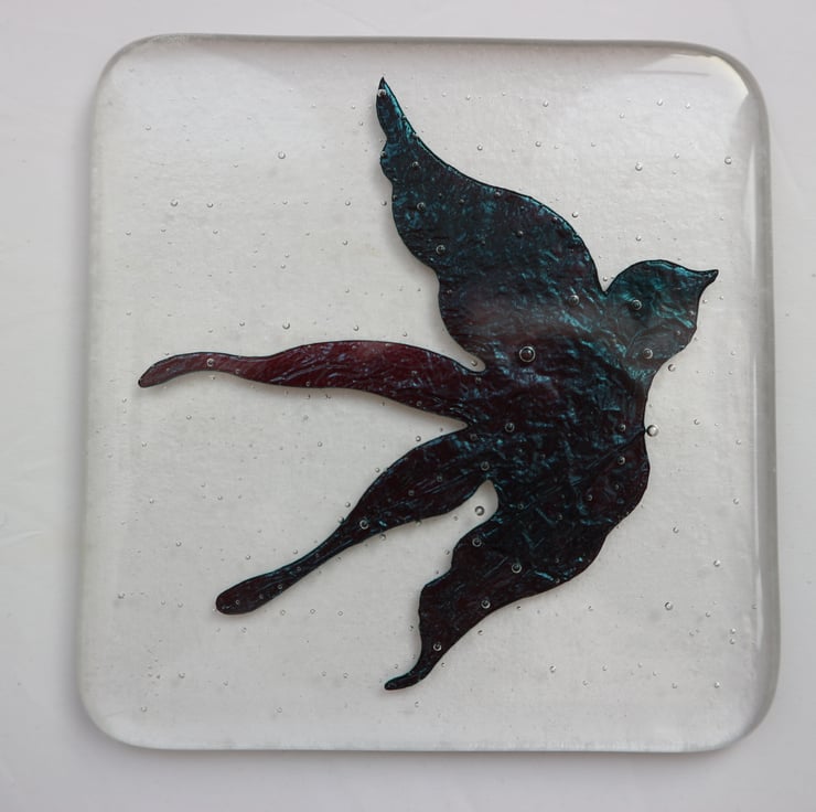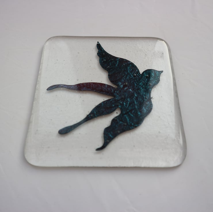 This coaster has a copper dove within clear glass. It has been fully annealed to make it strong and is suitable for use with hot tea or coffee cups but not pans straight from the oven. This would make a great gift or stocking filler.