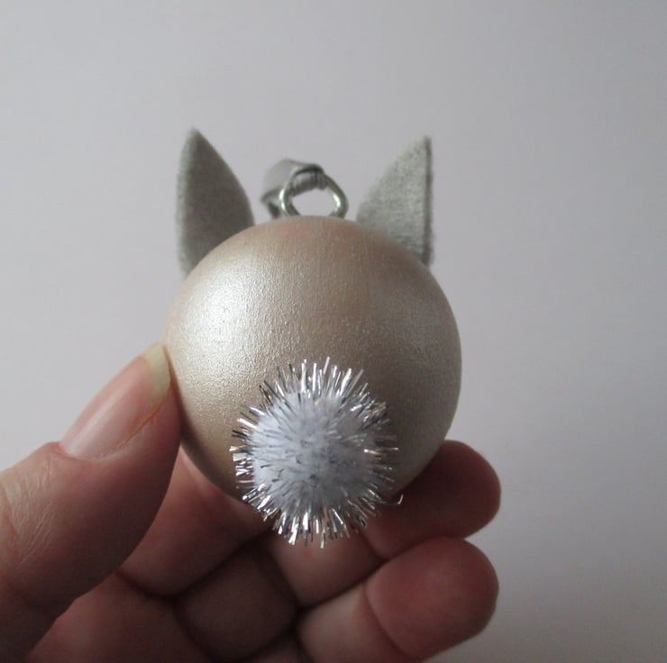 These wee bunnies are perfect for the tree of an animal lover. They are a metallic silver colour, and each bunny has a fluffy pom pom bobtail on his behind. They have silver ribbon to hang them by. As these wee bunnies don't have Christmas hats on they could be hung all year round as decorative items.