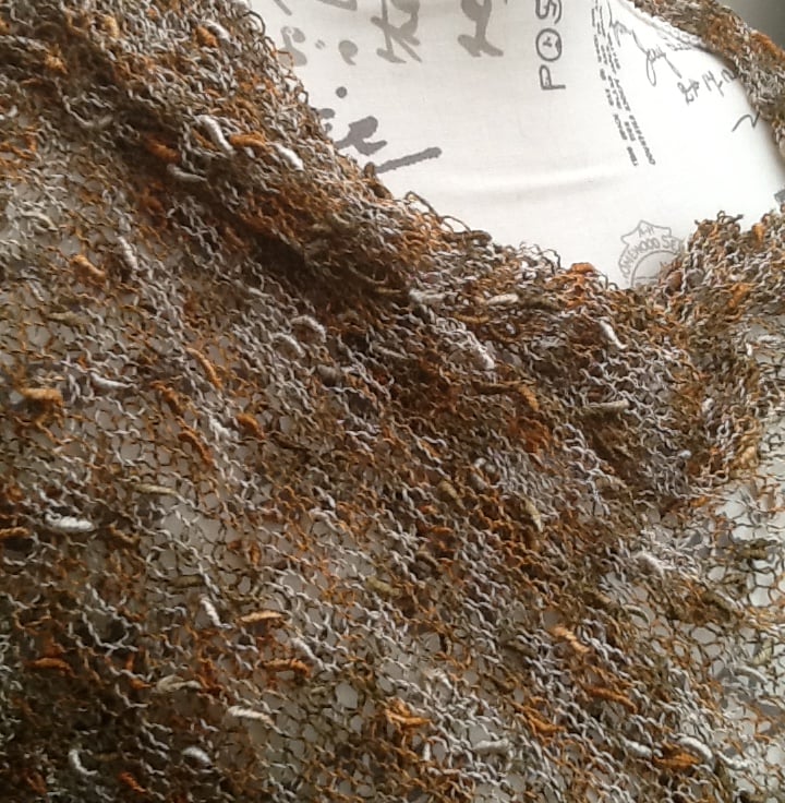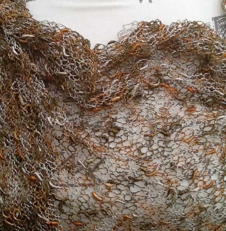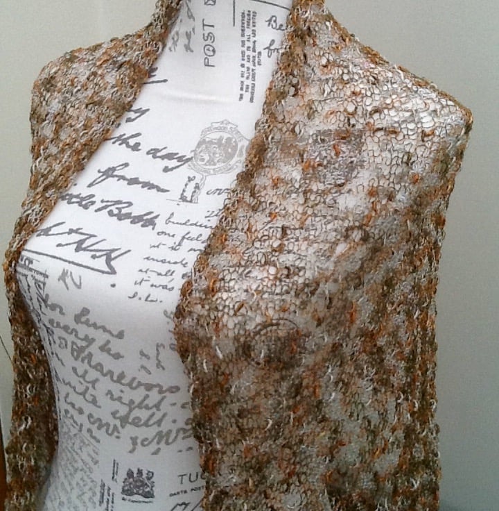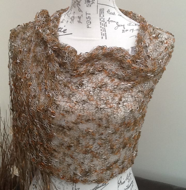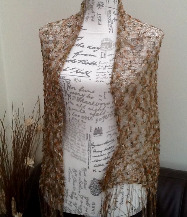 This shoulder wrap is very fine, it has been knitted on large needles to give a loose, lacy look, and then completed with an applied tassel fringe. The yarn is a boule yarn in various bronze and gold tones.